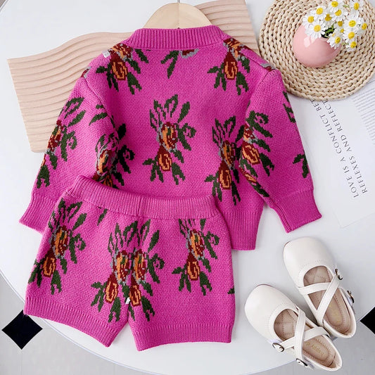 Flower Printed Sweater Cardigan+Short Skirt Two Piece Sweet Set